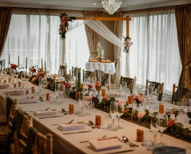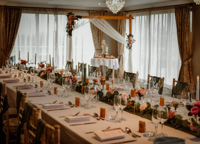 Golden candle sticks with LED candles set a beautiful tone for your wedding breakfast. Other pieces to set the mood include table runners, vases and flowers.